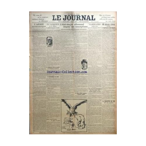 JOURNAL (LE) [No 9235] du 08/01/1918 - L'ARME ECONOMIQUE PAR ALFRED DE TARDE - UN VAINQUEUR DE LA MARNE LE GENERAL GROSSETTI EST MORT - L'ETAT-MAJOR ALLEMAND IMPOSE SES CONCEPTIONS - KAMERADES ! VOULEZ-VOUS QUE NOUS FASSIONS TREVE ? UNE GRAVE MUTINERIE DANS UNE ARMEE BOCHE - 800 PATISSIERS S'ELEVENT CONTRE LA SUPPRESSION DE LEUR INDUSTRIE - LA REQUISITION DES VINS SERA PLUS EQUITABLE.